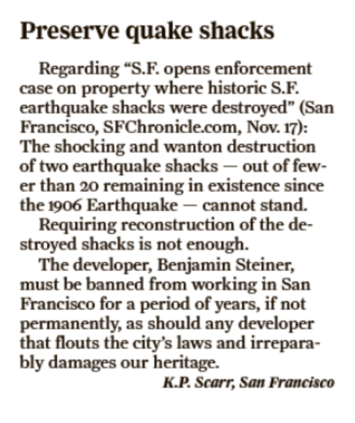 Mr. Schrader, however, is attempting to pit the privacy and sunlight of the neighbors against the preservation of the Earthquake Shacks. This is not acceptable. Both the Earthquake Shacks and the livability of the neighborhood can be preserved with an appropriate building plan.